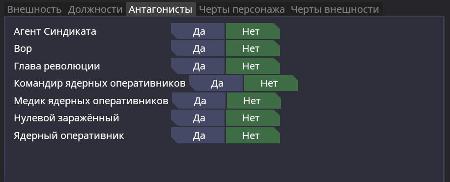 Антагонисты — позволяет сказать серверу, что вы готовы играть за одну из ролей антагонистов.