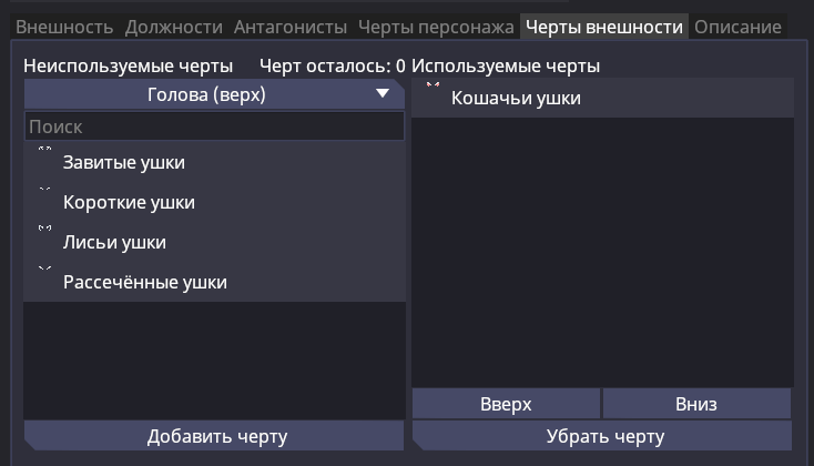 Черты внешности — позволяет добавить изюминку в свой внешний вид: хвост, уши, крылья и многое другое.