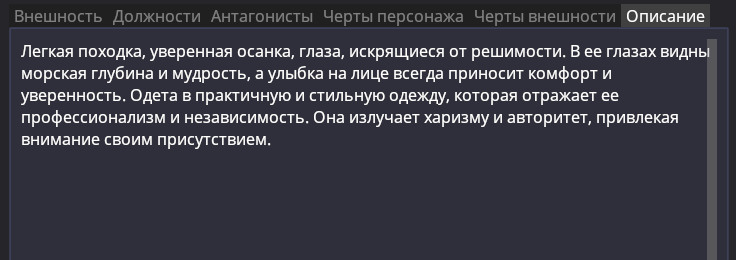 Описание — здесь вы можете описать внешний вид своего персонажа(на нашем сервере функция была убрана).