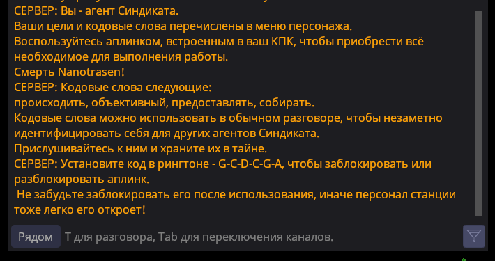 Быть антагонистом — это не оправдание для того, чтобы совершать убийства. Ваше пребывание на станции должно быть обусловлено лишь выполнением целей. Иногда это будут задания на убийство. Иногда это будет включать побег живым или славную смерть. Как вы достигнете своих целей, зависит от вас, но имейте в виду, что на станции есть другие агенты синдиката, у которых есть свои собственные цели. В то время как ваши цели имеют приоритет и могут не всегда совпадать с целями другого агента, вам, как правило, не следует безрассудно подвергать опасности их миссии, уничтожая станцию или совершая убийства вслепую. Если вам удастся их идентифицировать, то работа с ними действительно может быть взаимовыгодной!