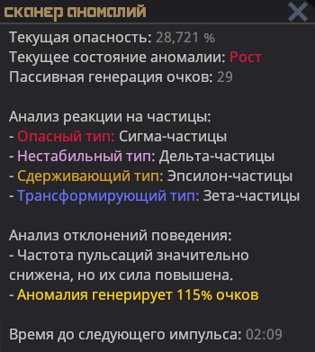 - Чувствительная: Обнаружена сильная реакция на частицы - Аномалия генерирует 120% очков